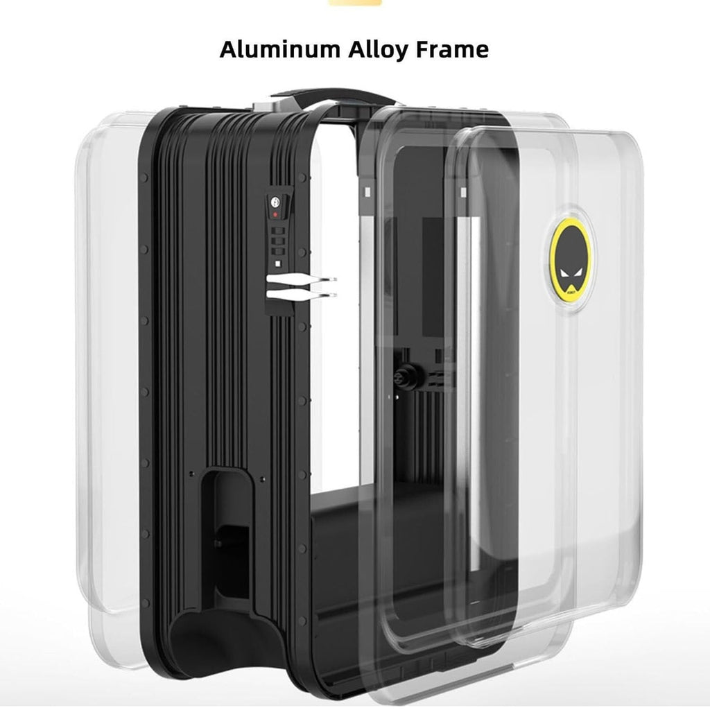 • DURABLE CONSTRUCTION WITH TSA-APPROVED LOCK: You can be sure that your belongings are safe with this tough aluminium ride on suitcase. The shell of the electric suitcase is made with aviation-grade aluminium coated with a protective PC film, and the rest of the rideable suitcase is crafted with high-quality ABS material for added strength and durability! With secure TSA-approved locks, you can rest easy knowing that your aluminium carry on luggage will pass through customs without any issues.